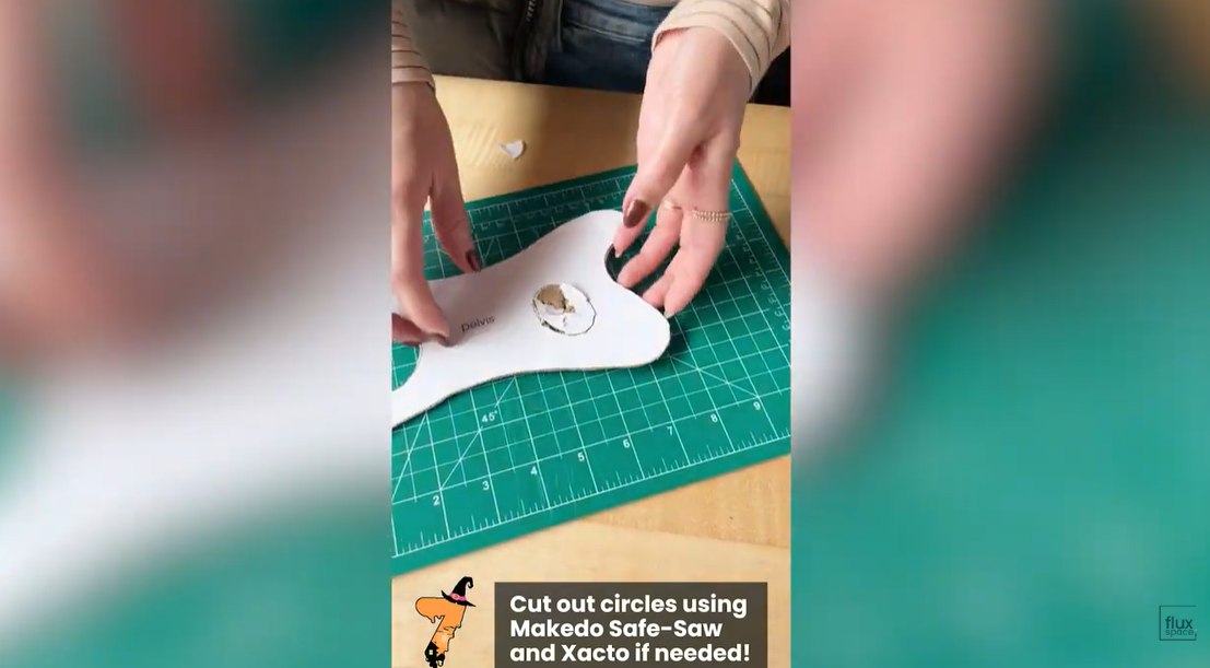Now that everything has been cut out and glued onto the cardboard, you’re ready to start cutting the cardboard with your ChompSaw! Make sure to take your time, going nice and slow to get the most precise cuts. For the pelvis piece, use the ChompSaw for the outer cut, then switch to the Makedo Safe-Saw to cut out the internal holes on a cutting mat. Teachers may assist with an X-acto knife for straighter cuts if needed.